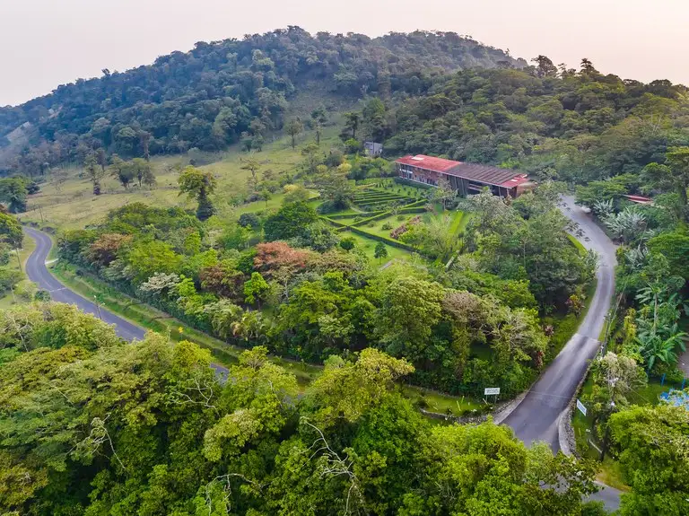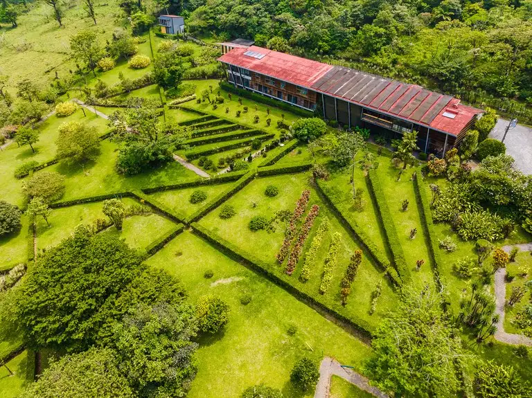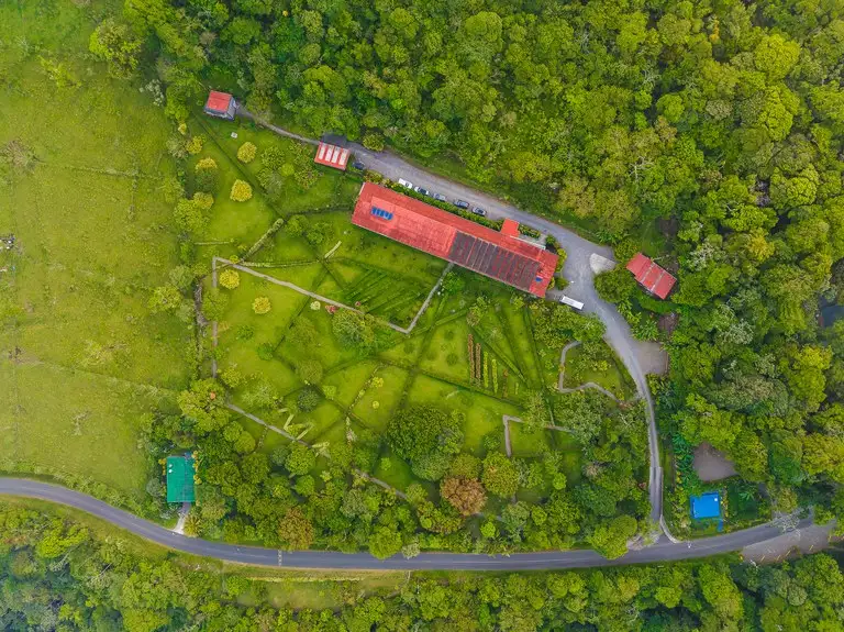 Nestled between two magnificent volcanoes, Celeste Mountain Lodge encompasses 17 acres of prime land, currently thriving as a successful lodge with the exciting potential to transform into a private eco-reserve. This estate offers ten acres preserved as a breathtaking rainforest reserve complete with hiking trails, complemented by five acres of lush, manicured gardens. Located in one of the most biodiverse microclimates in all of Costa Rica, the lodge sits at an elevation of 2,500 feet above sea level, where it enjoys year-round spring-like weather amidst the unique transition zone between rainforests and cloud forests.